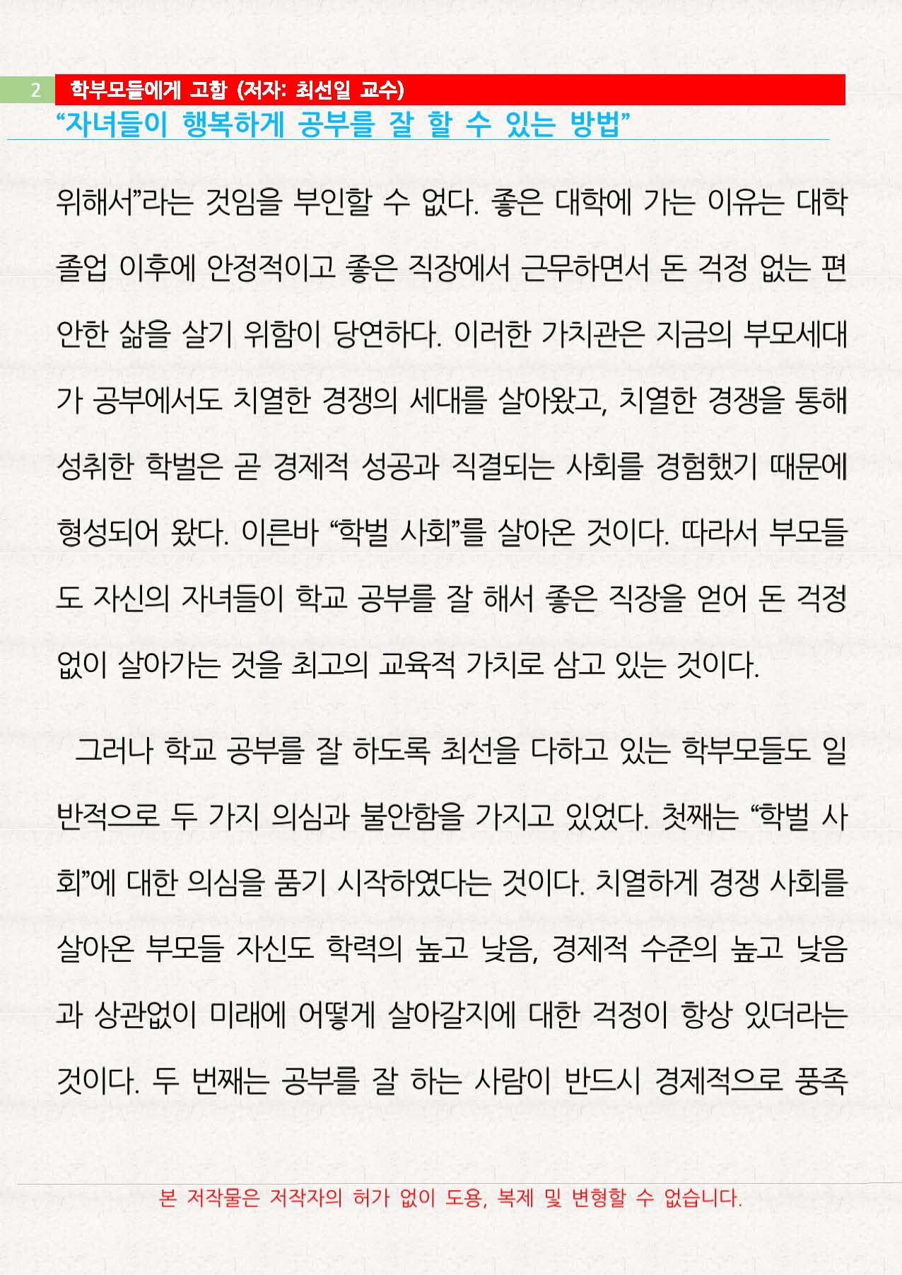 “학부모들에게 고함” (부제: 자녀들이 행복하게 공부를 잘 할 수 있는 방법)은 20년간 교육계에 몸담고 있는 현직 대학교수인 최선일 교수의 경험과 고민을 학부모님들과 함께 나눌 수 있는 장입니다.